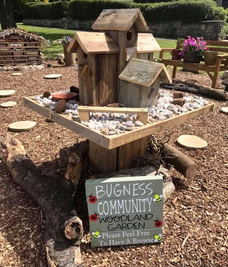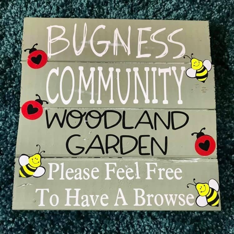 (Image caption(right): the wooden “Bugness Community Woodland Garden” sign, with brightly coloured bees and ladybirds drawn around the wording.)