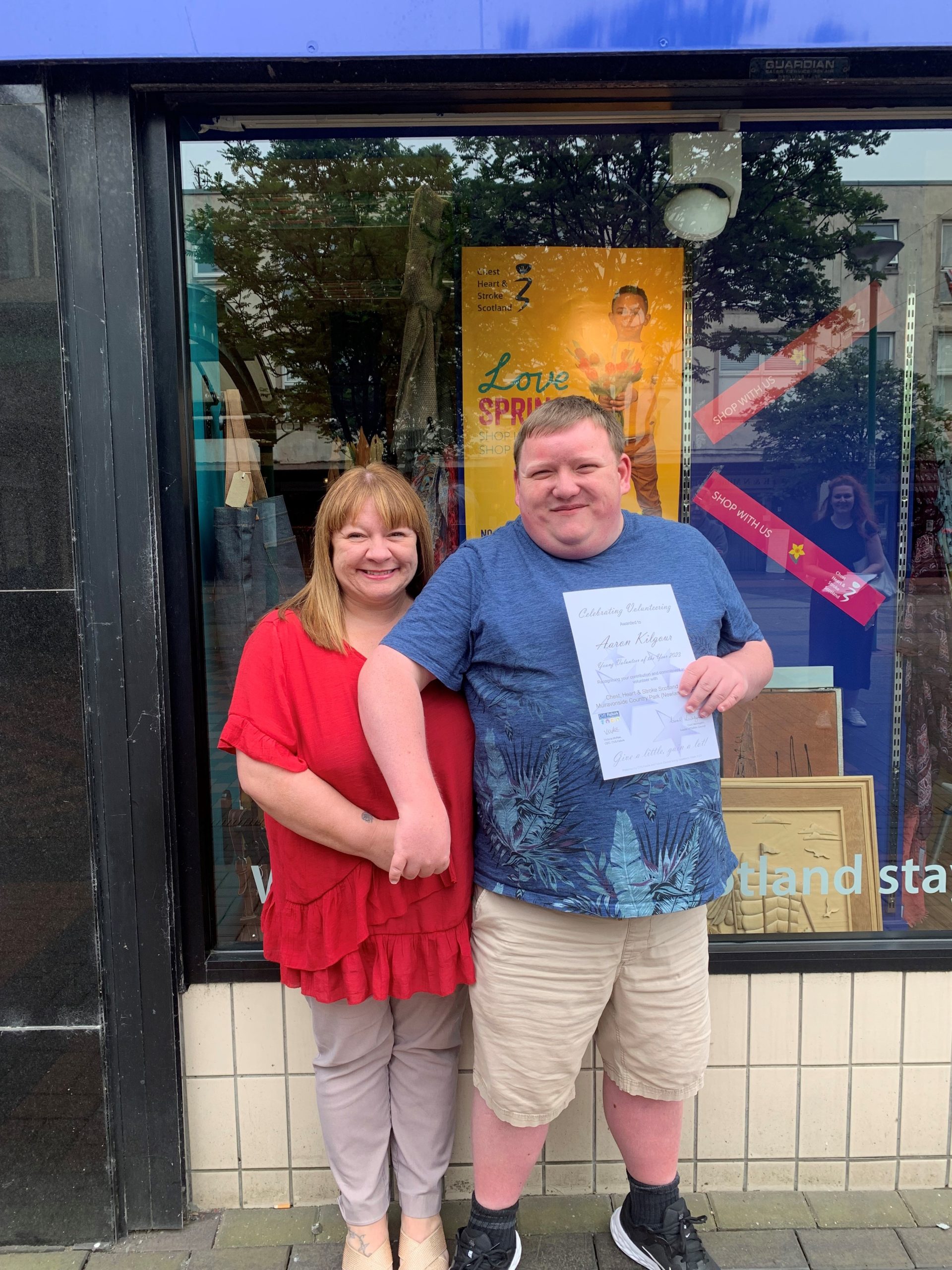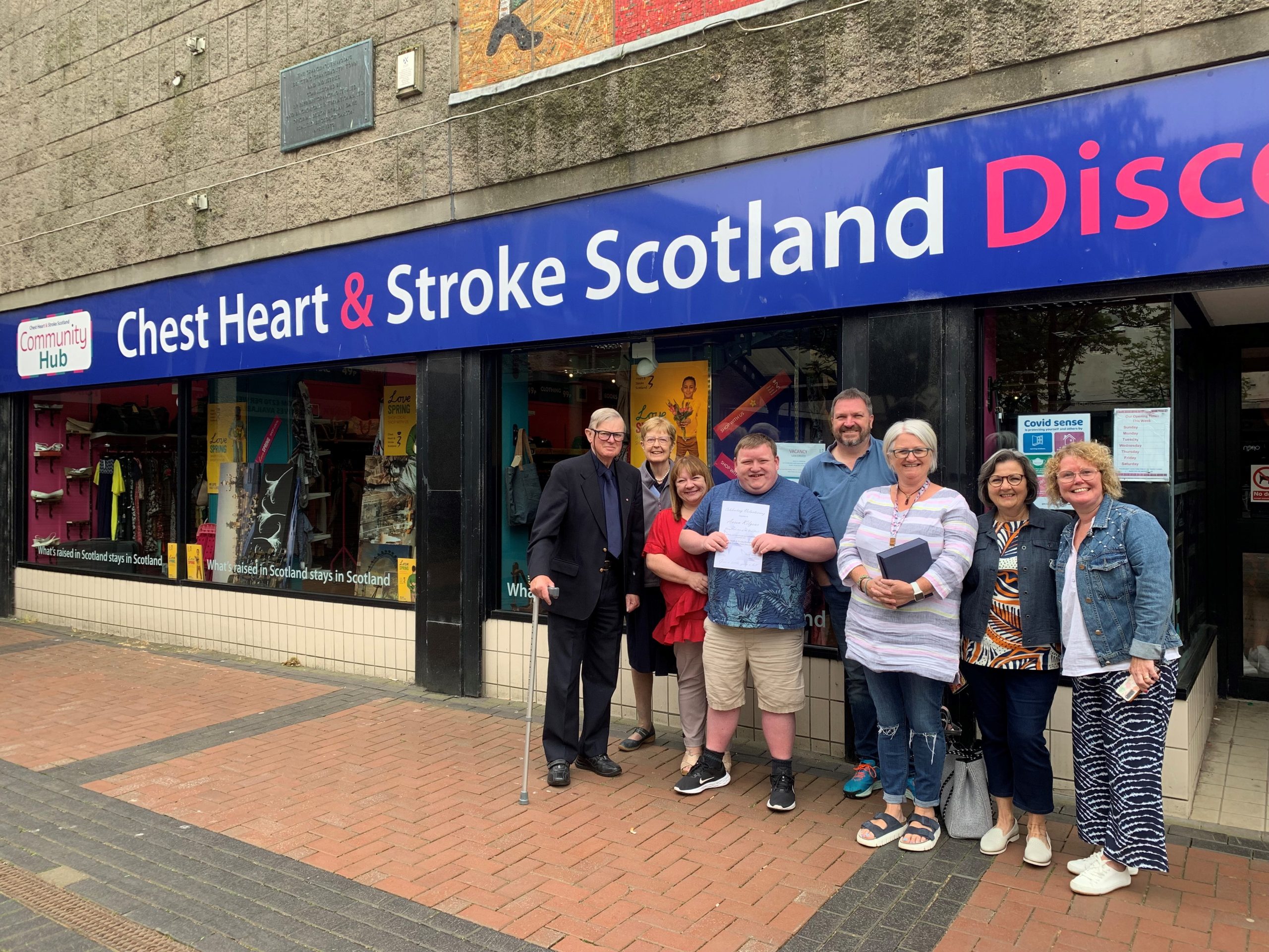 (Image caption: Aaron (centre left) with his award, and friends and family, outside the Chest, Heart & Stroke Scotland shop.)